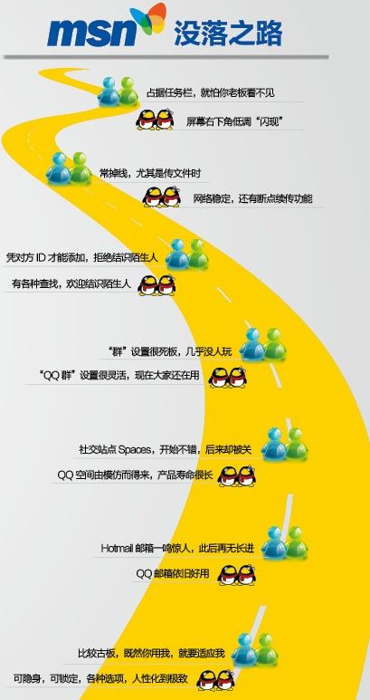 作為用戶(hù),我99年開(kāi)始用QQ,2000年用MSN;QQ上面高中同學(xué)比較多,大學(xué)同學(xué)就基本上都是加MSN了。然后工作之后因為我覺(jué)得QQ太鬧騰,就長(cháng)期不用了,隔四個(gè)月上去一次看一下留言。