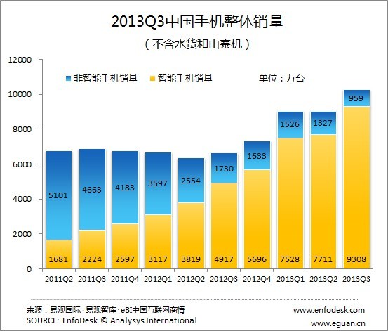 根據Enfodesk易觀(guān)智庫最新發(fā)布的《2013年第3季度中國手機市場(chǎng)監測報告》顯示,3季度中國手機(不含水貨和山寨機)銷(xiāo)量為10266萬(wàn)臺,環(huán)比增長(cháng)13.6%,同比增長(cháng)54.5%。其中,智能手機銷(xiāo)量為9308萬(wàn)臺,環(huán)比增長(cháng)率為20.7%,同比增幅更是高達89.3%。智能手機占整體市場(chǎng)份額持續上升至90.7%。
